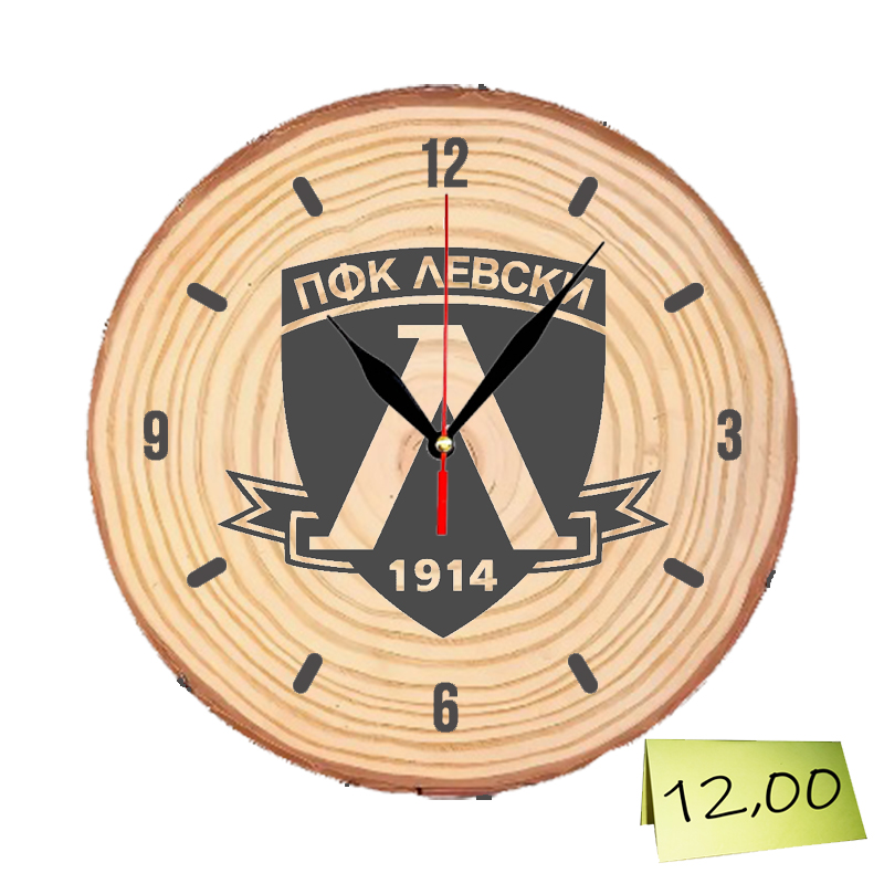 Настолен часовник от дървесен отрязък с гравирана старата емблема на Левски.