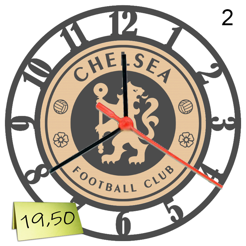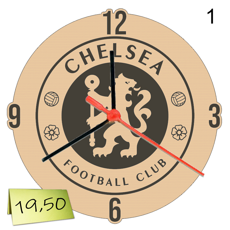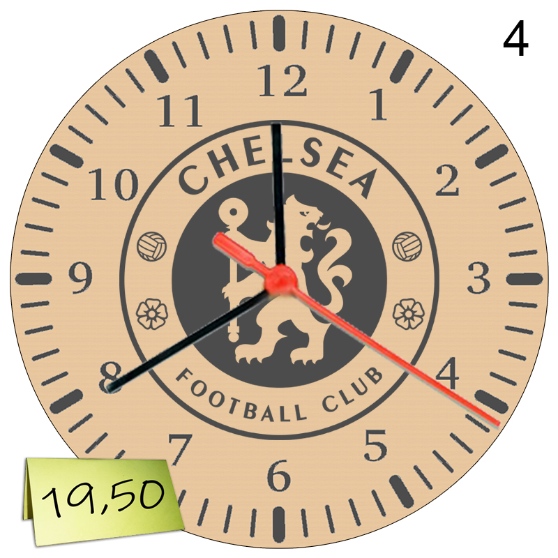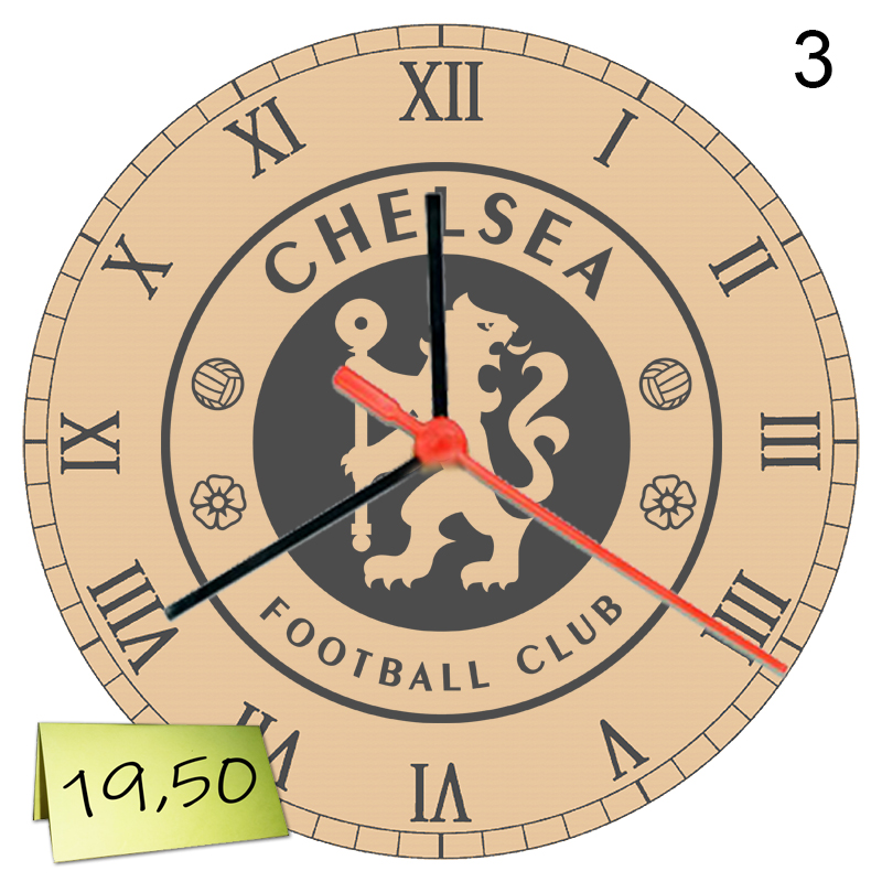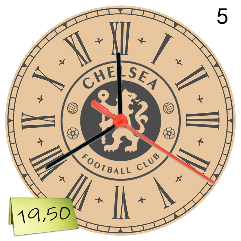 Стенен часовник с гравирана емблемата на Челси в пет варианта.
