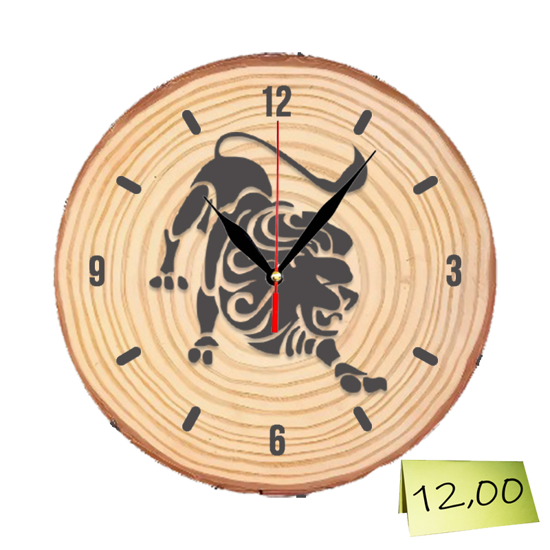 Настолен часовник от дървесен отрязък с гравиран знака на зодия Лъв.